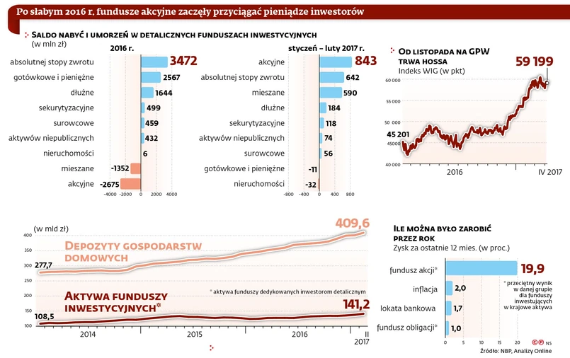 Sygnały o większym apetycie na ryzyko płyną także z towarzystw funduszy inwestycyjnych (TFI) oraz banków. Z danych Analiz Online, firmy monitorującej TFI, wynika, że zarówno w styczniu, jak i w lutym klienci wpłacali do detalicznych funduszy akcji polskich po ponad 300 mln zł. To najlepszy wynik od maja 2015 r.
