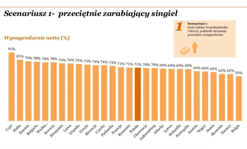 W raporcie podano, że w przypadku Polaków o przeciętnych zarobkach średnie wynagrodzenie netto, czyli po odjęciu podatku dochodowego od osób fizycznych oraz składek pracowniczych na ubezpieczenia społeczne, wynosi 71 proc. wynagrodzenia brutto.
