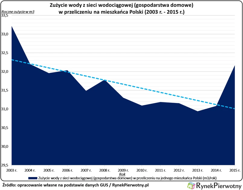 Dane GUS-u dotyczące lat 2003 - 2015 wskazują, że w tym okresie był widoczny wyraźny trend spadkowy, jeżeli chodzi o zużycie sieciowej wody przez gospodarstwa domowe – tłumaczy Andrzej Prajsnar, ekspert portalu RynekPierwotny.pl. To roczne zużycie wyrażone w metrach sześciennych na jednego Polaka, pomiędzy 2003 r. oraz 2014 r. spadło o mniej więcej 6%. Taka zmiana po części mogła być wymuszona rosnącymi cenami wody i coraz powszechniejszym opomiarowaniem mieszkań. Wspomniane czynniki oczywiście zachęcają do oszczędzania wody. W tym kontekście ciekawy wydaje się nagły wzrost zużycia wody wodociągowej z 2015 r. Wspomniany wzrost prawdopodobnie miał charakter incydentalny i był związany z wyjątkowo gorącym latem. Niestety nie dysponujemy jeszcze danymi, które pozwoliłyby na sprawdzenie, jak zużycie wody wyglądało w 2016 r.