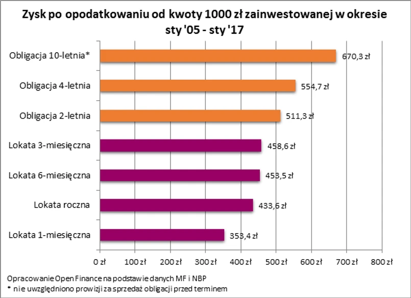 Szacunki Open Finance oparte o dane Ministerstwa Finansów i Narodowego Banku Polskiego potwierdzają, że wybór obligacji skarbowych jest rozwiązaniem bardziej intratnym niż przeciętnej lokaty. W gronie produktów bankowych najwyższe odsetki można było wypracować odnawiając co kwartał lokatę trzymiesięczną. Łącznie na konto inwestora na początku 2017 roku trafiłoby 1458,6 zł – prawie o 45,9% więcej niż kwota wyjściowa i mowa jest tu już o sumie po potrąceniu podatku.