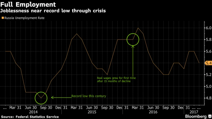 Bezrobocie w Rosji wynosi w tej chwili zaledwie 5,4 proc., co jest najniższym wynikiem w tym roku (w zeszłym miesiącu było to 5,6 proc.). Realne płace wzrosły o 1,5 proc., natomiast sprzedaż detaliczna skurczyła się w ujęciu rocznym już 27. miesiąc z rzędu.