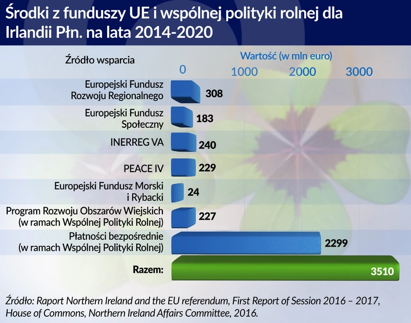 Rozpoczęcie procesu negocjacji warunków Brexitu i niepewność, co do ustaleń dotyczących dalszych kierunków współpracy Wielkiej Brytanii z Unią budzi niepokój w 1,8-mln Irlandii Północnej. Główna obawa wiąże się z realną możliwością utraty środków z funduszy strukturalnych UE oraz instrumentów wspólnej polityki rolnej. W perspektywie budżetowej UE na lata 2014–2020 przeznaczono dla Irlandii Płn w sumie 3,5 mld euro. Do tego dochodzi 145 mln euro w ramach programu Horyzont 2020 wspierającego badania i innowacje.