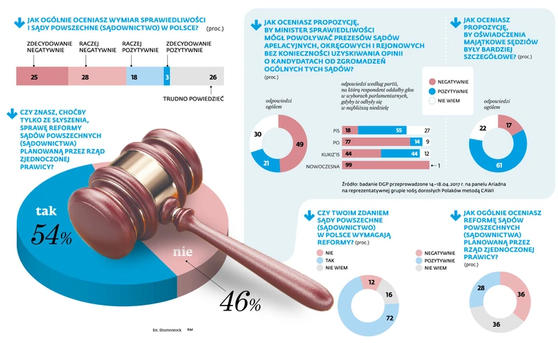Z sondażu wynikają dwie podstawowe kwestie. Po pierwsze Polacy źle oceniają wymiar sprawiedliwości. Tego zdania jest ponad 50 proc. pytanych. – Boli mnie, że nadal tylko 31 proc. badanych ma dobre zdanie o polskim sądownictwie. Choć oczywiście nie jest to zaskoczenie, zwłaszcza gdy weźmie się pod uwagę, że obecny rząd zdaje się być na wojnie z sędziami – mówi Jarosław Gwizdak, prezes Sądu Rejonowego Katowice-Zachód. Drugi wniosek z sondażu: reformy sądownictwa chce 70 proc. pytanych. – To potwierdza, że to, co robimy, jest konieczne – twierdzi Michał Wójcik, wiceminister sprawiedliwości. – Ten sondaż pokazuje, że prawdziwa reforma jest potrzebna, tyle że żadna z ustaw ministra Ziobry, które wpłynęły do Sejmu, nie jest reformą – ocenia Borys Budka, minister sprawiedliwości w rządzie PO-PSL.