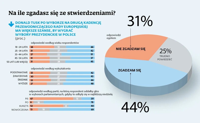 Wszystko wskazuje na to, że kandydatura byłego szefa PO będzie silnie polaryzowała scenę polityczną. Zdaniem specjalistów na dłuższą metę nie ma jednoznacznych wygranych i przegranych nieudanej próby zastopowania kandydatury Tuska w Brukseli przez polski rząd. – Z jednej strony plan Kaczyńskiego, by dotrzeć z przekazem, że Tusk nie jest polskim kandydatem, zadziałał. Choć, jak widać, z drugiej strony dla wielu osób przewodniczący UE dobrze reprezentuje polskie interesy. Potencjał do wygrania sytuacji jest po obu stronach –podkreśla dr Tomasz Baran z Wydziału Psychologii UW, parter merytoryczny w panelu Ariadna. ⒸⓅ