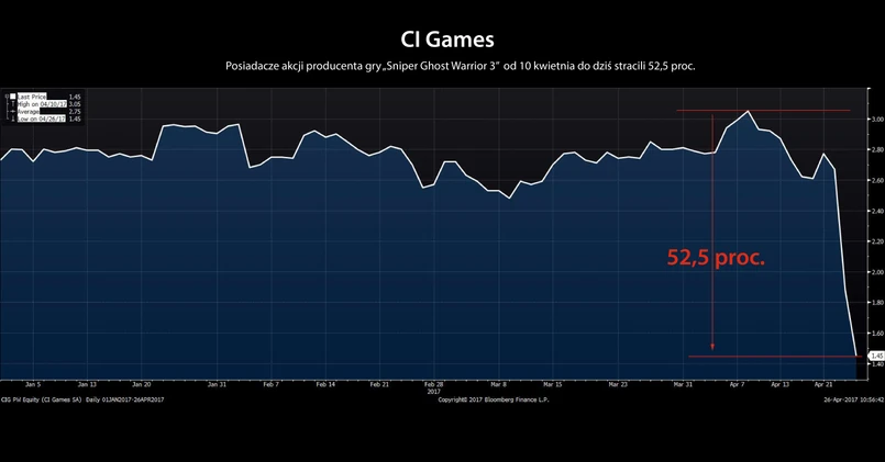 Najmłodsze dziecko CI Games – gra Sniper Ghost Warrior 3 – spotkała się z falą krytyki w mediach. Specjaliści z branży zarzucają producentowi, że gra jest niedopracowana i pełna błędów. Negatywne recenzje w mediach bardzo szybko odbiły się na wycenie giełdowej spółki. Wtorkowa sesja na GPW, podczas której handel akcjami spółki był wielokrotnie zawieszany, zakończyła się dla producenta gier stratą sięgająca 29,6 proc. przy obrotach rzędu 37 mln zł. To nie koniec wyprzedaży. Cena akcji CI Games spadał też od początku środowych notowań. Około godziny 11:00 kurs spółki tracił ponad 22 proc., a za jedną akcję inwestorzy płacili 1,47 zł. Nastroje zaczęły poprawiać się dopiero po południu. Tuż przed 14:00 straty wyhamowały do ok. 7 proc.