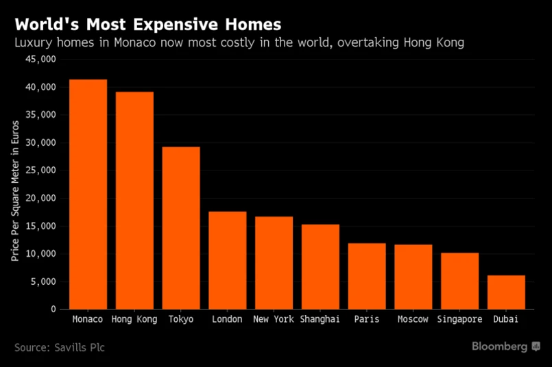 Średnia cena sprzedawanych mieszkań w Monako wyniosła w 2016 roku 4,3 mln euro. Zestawienie miast z najdroższymi nieruchomościami znajduje się na zamieszczonym wykresie.
