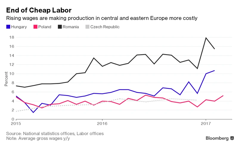 Jednak nic nie trwa wiecznie. Przyspieszenie wzrostu płac w państwach dawnego bloku państw socjalistycznych może zmienić to postrzeganie. Według danych urzędu statystycznego, roczny wzrost średniego wynagrodzenia nominalnego na Węgrzech wyniósł w lutym 10,7 procent. To największy skok wynagrodzeń od dziewięciu lat. W Polsce w ciągu 12 miesięcy płace wzrosły o 5,2 proc. - najmocniej od czerwca ubiegłego roku. To tylko dwa przykłady trendu, jaki jest widoczny w całym regionie.