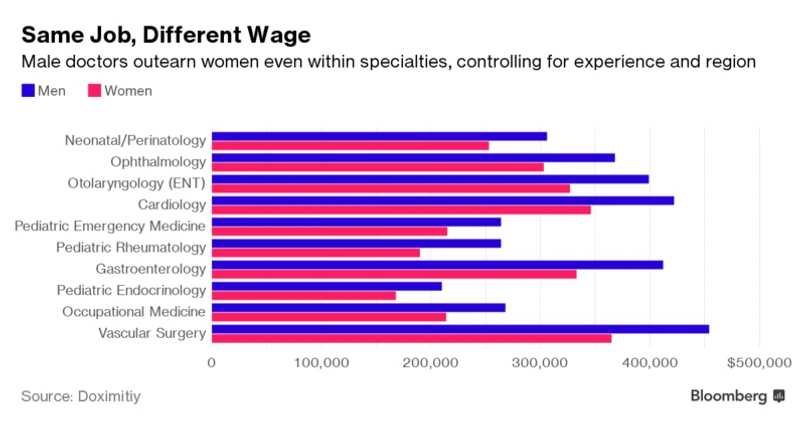 Dużą różnicę w wysokości wynagrodzeń przedstawicieli obu płci wyjaśniano w przeszłości tym, że kobiety wykonują częściej niskopłatne stanowiska, głównie w pediatrii oraz opiece podstawowej. To jednak mało przekonująca argumentacja.