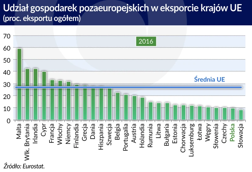 Spośród wszystkich krajów UE Polska odznacza się najniższym obok Słowacji udziałem gospodarek innych niż europejskich w eksporcie. Największy udział gospodarek pozaeuropejskich w eksporcie mają największe kraje UE, jak Wielka Brytania, Francja, Włochy, Niemcy – średnia dla tych krajów to 33,6 proc. w 2016 r. (42,2 proc. w Wielkiej Brytanii, 33,1 proc. we Francji, 32,4 proc. we Włoszech, 31,6 proc. w Niemczech)