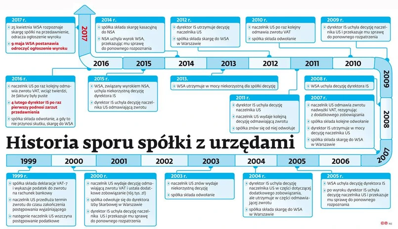 W deklaracjach VAT-7 złożonych za grudzień 1998 r. i luty 1999 r. spółka wykazała do zwrotu łącznie 550 tys. zł. Liczyła na to, że pieniądze otrzyma w ciągu 25 dni. Naczelnik Urzędu Skarbowego Warszawa-Praga przedłużył jednak termin zwrotu do czasu zakończenia postępowania wyjaśniającego. Spółka nie przypuszczała wtedy, że spór o to będzie toczył się aż do dzisiaj.