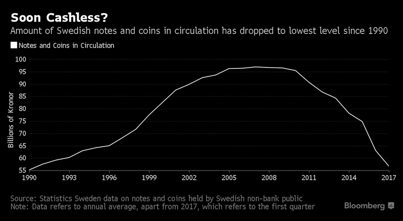 Statystyki o podaży pieniądza pokazują coraz większą niechęć Szwedów do gotówki. Liczna banknotów i monet w obiegu publicznym spadła do 56,8 mld koron w pierwszym kwartale tego roku. To był najniższy poziom od 1990 roku i aż 40 proc. poniżej szczytu z 2007 roku. Tempo spadku było największe w 2016 roku.