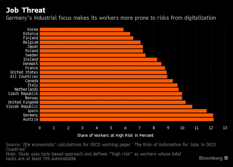 Cyfryzacja stanowi większe zagrożenie dla miejsc pracy w największej gospodarce Europy niż dla gospodarek opartych na usługach jak Francja, czy USA – twierdzi Achim Wambach, szef Centrum Badań nad Gospodarką ZEW w Mannheim. - Rząd może zrobić wiele, aby zabezpieczyć ekonomicznie gospodarkę kraju poprzez podjęcie działań mających na celu zwiększenie wiedzy technologicznej i infrastruktury, aby przeciwdziałać ryzyku - dodał.