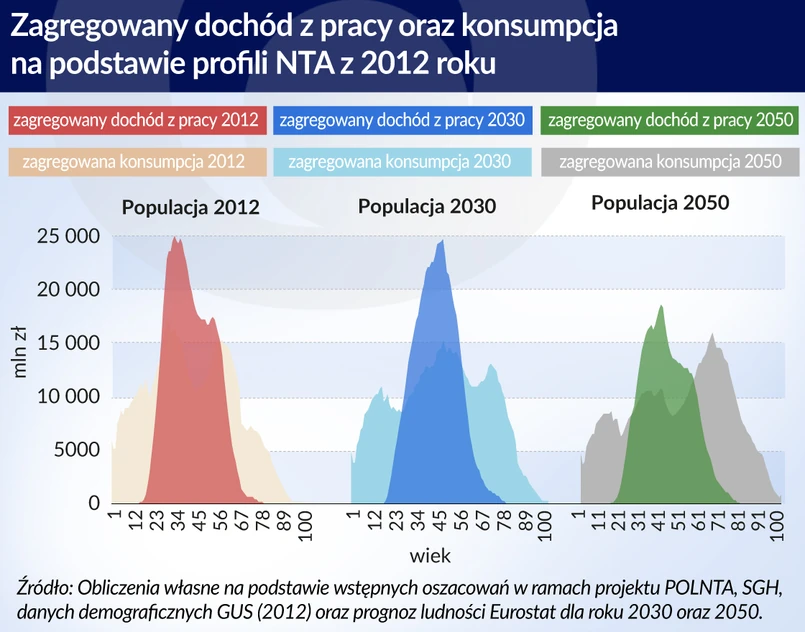 Równowagę między konsumpcją i zarobkami przeciętnie osiągamy koło 26 roku życia i utrzymujemy ją do 57 roku życia. Osoby starsze nie finansują już własnej konsumpcji – wiele z nich utrzymuje się z transferów publicznych, czyli ze świadczeń.