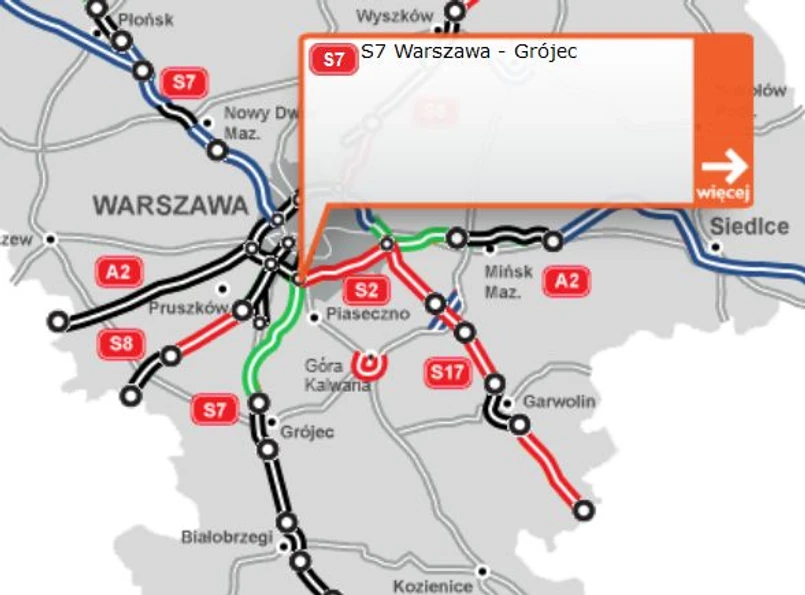 Na odcinku od węzła Warszawa Lotnisko do węzła Lesznowola trasa będzie mieć dwie jezdnie po trzy pasy ruchu. Dalej trasa - aż do obwodnicy Grójca - ma mieć dwie jezdnie po dwa pasy ruchu.