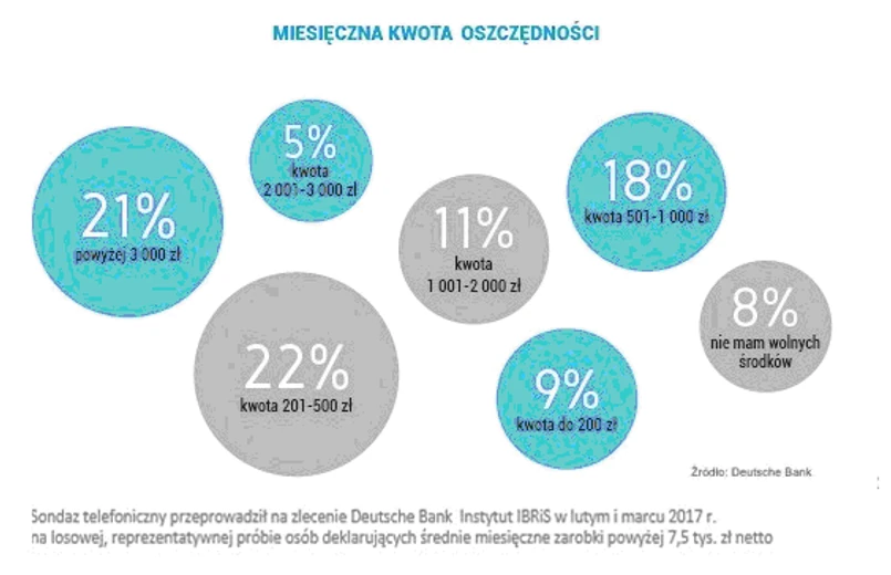 Jak pokazało badanie wykonane na potrzeby raportu Deutsche Bank „Portret zamożnego Polaka – Klienta Premium”, co piąta osoba zarabiająca powyżej 7,5 tys. zł netto miesięcznie nie odkłada, ani nie inwestuje oszczędności z myślą o budowaniu kapitału na przy¬szłość. To i tak dobry wynik, bo w całej populacji nie oszczędza dwa razy więcej osób.