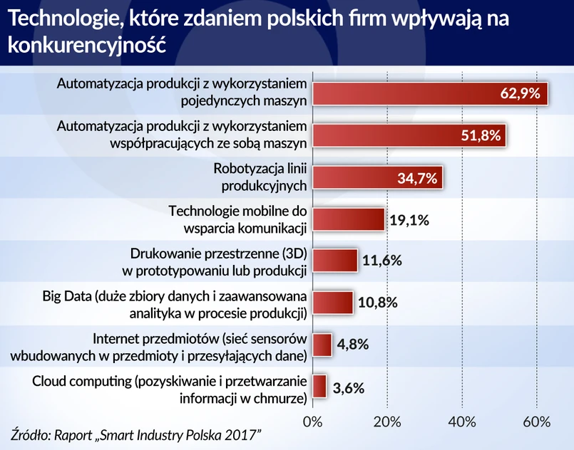 W badaniu „Smart Industry Polska 2017” zleconym przez Ministerstwo Rozwoju i Siemensa, przeprowadzonym na próbie 251 małych i średnich firm, okazało się, że aż 77 proc. z nich wdrożyło w 2016 roku przynajmniej jedno z rozwiązań wspierających innowacyjność (najpopularniejsza jest automatyzacja z wykorzystaniem pojedynczych maszyn – 48,6 proc. firm, wykorzystanie współpracujących ze sobą maszyn jest na trzecim miejscu z 27 proc. wskazań).