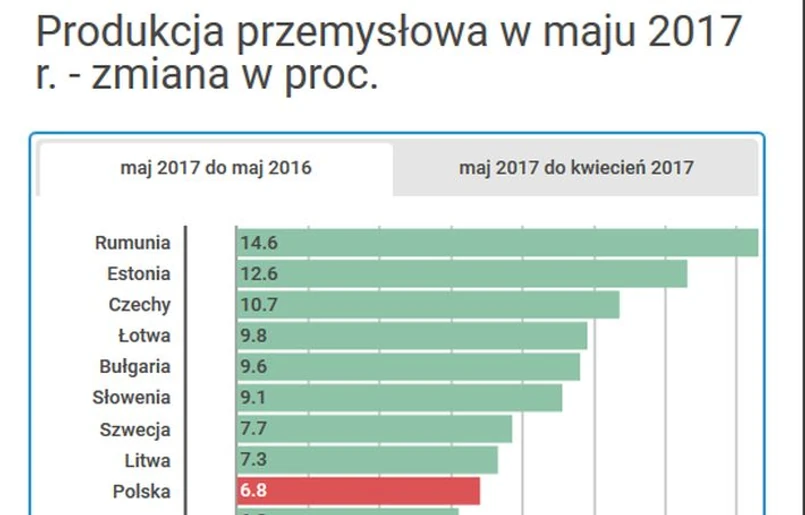 Wśród państw członkowskich, dla których dostępne są dane, największe przyrosty produkcji przemysłowej odnotowano w Rumunii (+ 14,6 proc.), w Estonii (+ 12,6 proc.) i w Republice Czeskiej (+ 10,7 proc.). Na Malcie i Zjednoczonym Królestwie odnotowano spadek (oba -0,7 proc.). W Polsce roczny wzrost produkcji przemysłowej sięgnął 6,8 proc.