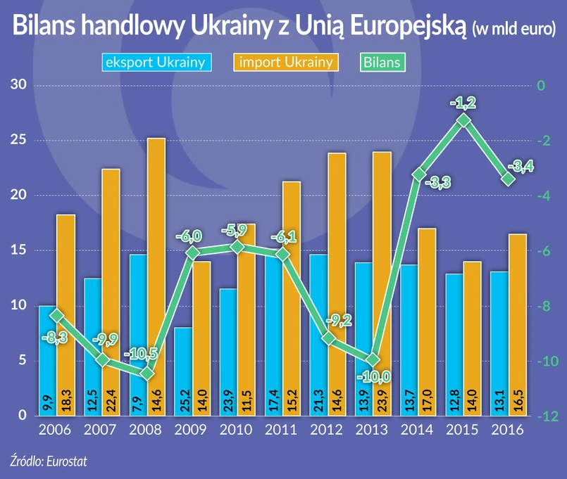 Z opublikowanej przez Eurostat w połowie lipca z okazji 19. szczytu Ukraina-UE informacji wynika, że najwyższe nadwyżki handlowe z Ukrainą ma gospodarka Niemiec (2,2 mld euro) oraz Polski (1,6 mld euro). Niemcy mają 22-procentowy udział w eksporcie z Unii do Ukrainy, a udział Polski wynosi 21 proc. Do Polski trafia około 14 proc. ukraińskiego eksportu do Unii (1,8 mld euro w 2016 r.). Największy deficyt w obrotach handlowych z Ukrainą mają Włochy (0,9 mld euro) oraz Hiszpania (0,8 mld euro).