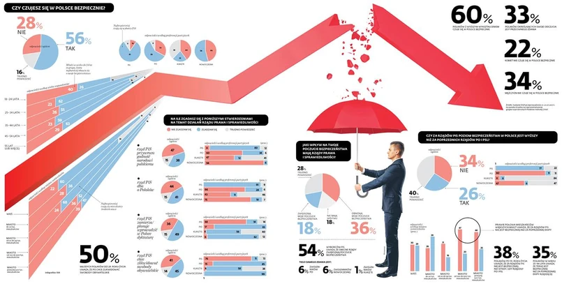 Paradoksem jest, że choć sędziowie nie są lubianą grupą zawodową i ze świecą szukać osoby, która uważa, że wymiar sprawiedliwości nie wymaga reformy, to ta przygotowana przez PiS została uznana za zamach na trójpodział władzy oraz zrodziła rzeszę obrońców „kasty”, którzy stanęli na straży niezależności sądów. Oraz poczucia bezpieczeństwa. Bo od kiedy PiS jest u władzy, mocno ono zmalało w tej grupie. Na pytanie o wpływ rządów ugrupowania Jarosława Kaczyńskiego na poczucie bezpieczeństwa aż 62,7 proc. wyborców PO badanych w sondażu na panelu badawczym Ariadna, odpowiedziało, że jest niższe, 6,1 proc. – większe, a dla 24,3 proc. pozostaje bez wpływu. Wśród wyborców Nowoczesnej wyniki przedstawiają się podobnie, bo 61 proc. odczuwa spadek, 6 proc. wzrost, a 33 proc. brak wpływu. U wyborców Kukiz’15 przeważa niezdecydowanie – aż 74,7 proc.