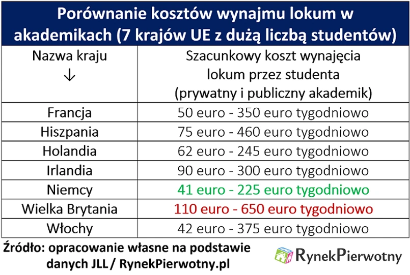 Na tle innych krajów Europy, Wielka Brytania wyróżnia się zdecydowanie największą liczbą zagranicznych studentów (około dwukrotnie większą niż w przypadku Francji oraz Niemiec). Zainteresowanie studiami w Zjednoczonym Królestwie, stwarza dobre warunki dla firm prowadzących prywatne akademiki. Niektóre takie przedsiębiorstwa, posiadają nawet 30 000 - 50 000 miejsc noclegowych. Czynsze pobierane przez prywatnych operatorów, niestety są znacząco wyższe niż w przypadku Niemiec oraz Francji. Tygodniowy koszt wynajmu może oscylować na poziomie nawet 500 euro - 600 euro – wskazuje ekspert portalu RynekPierwotny.pl. Najwyższych stawek oczywiście można się spodziewać w Londynie i okolicach tego miasta.