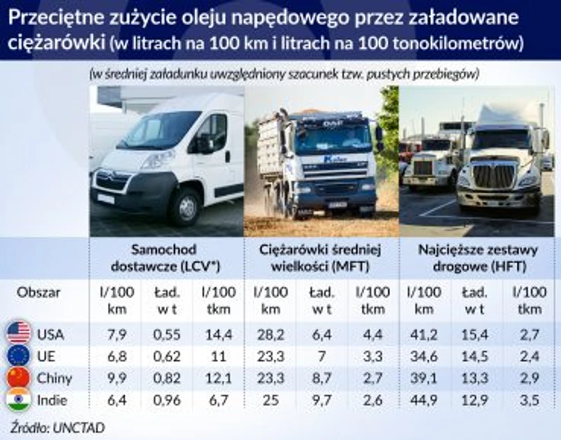 Potężny ciągnik radzący sobie z naczepą o wadze 30 ton i więcej potrafi zużyć dobrze ponad 40 litrów oleju napędowego na 100 km. Z uwagi na swą wielką ładowność taki zestaw przewyższa jednak pod względem efektywności paliwowej mierzonej w tzw. tonokilometrach ciężarówki średniej wielkości, o samochodach dostawczych nie wspominając (przykładowe dane na wykresie).