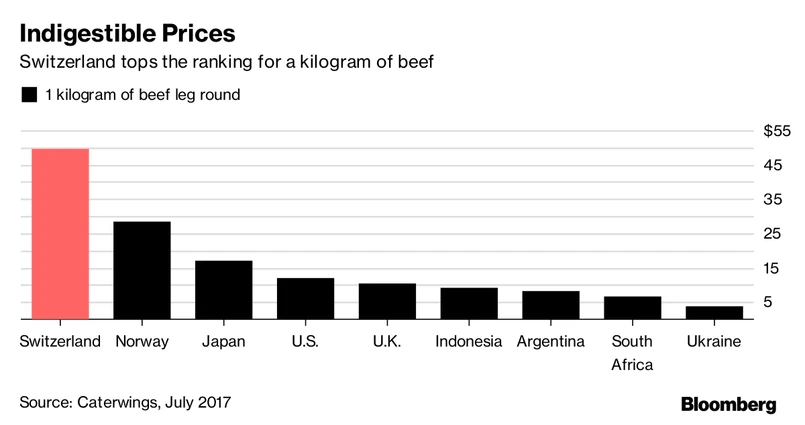 Szwajcaria osiągnęła poziom 49,68 dolarów za kilogram wołowiny. Jednak ta pozornie wygórowana kwota - około 150 procent wyższa od średniej światowej - staje się bardziej rozsądna, gdy uwzględni jakie płace dostają mieszkańcy - niewykwalifikowany pracownik potrzebuje zaledwie 3,1 godziny na to, aby móc kupić kilogram tego mięsa.