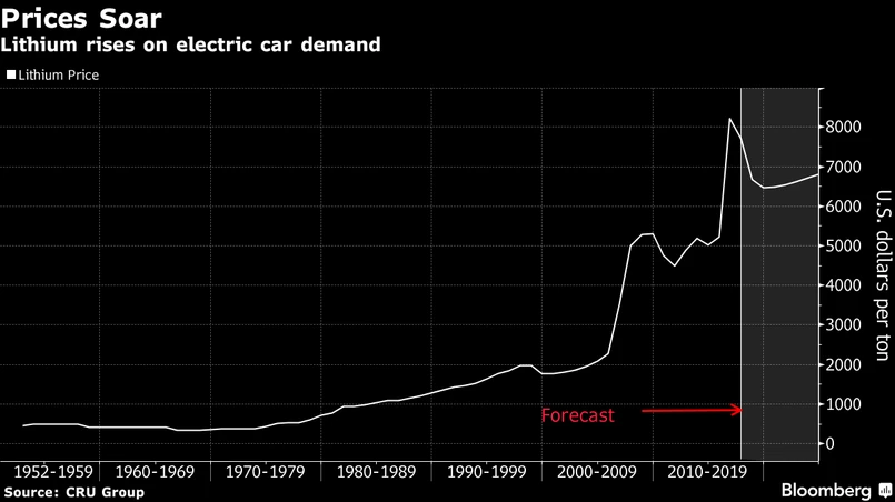 Zdaniem UBS, cena węglanu litu, podstawowej substancji chemicznej wytwarzanej przez przemysł wydobywczy, wzrosła ponad dwukrotnie w ciągu pięciu lat do 2016 r. Wg Benchmark Mineral, substancja ta wzrosła o około 5 proc. do średnio 14.250 dolarów za tonę od czerwca do lipca.