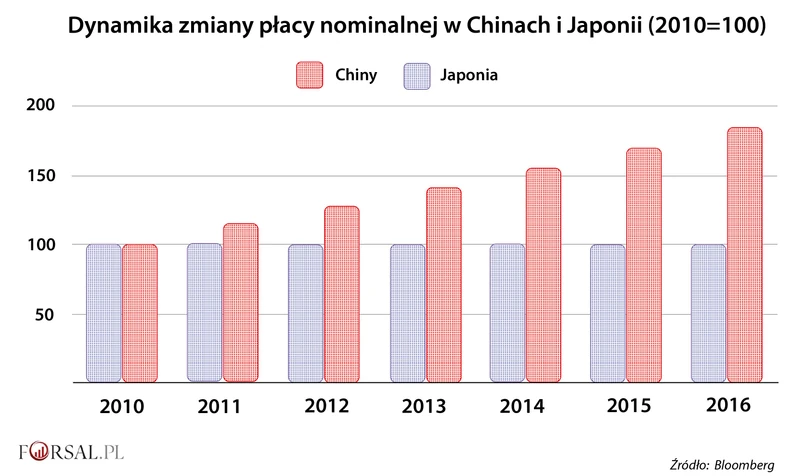 Wyniki corocznej ankiety przeprowadzonej przez japońską organizację handlu zagranicznego wskazują, że wzrost płac w Chinach skłania część japońskich firm do przenoszenia miejsc pracy, fabryk i przedsiębiorstw z powrotem do kraju. Według ankiety spośród około 3000 firm, które niedawno przeniosły lub zamierzały przenieść swoje operacje za granicę, 8,5 procent wróciło do Japonii właśnie z Chin. W przeciwnym kierunku, czyli z Japonii do Chin, przeniesienie działalności deklarowało 6,8 proc. przedsiębiorstw. To najniższy wyniki w historii sondaży, które prowadzone są od 2006 r.