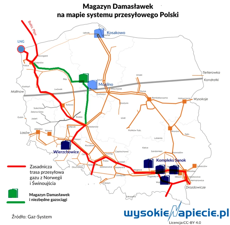 Dodatkowo nowy magazyn ma leżeć na planowanej odnodze trasy przesyłu gazu z Bramy Północnej – czyli terminala LNG i gazociągu Baltic Pipe – na południe, co poprawi bezpieczeństwo i płynność dostaw tą drogą. Do tego jednak niezbędne będzie wybudowanie ok. 450 km gazociągów dużej średnicy – od Goleniowa pod Szczecinem do Damasławka, i dalej do Mogilna i węzła w Odolanowie.