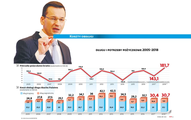 Z projektu budżetu wynika też, że MF planuje bardziej aktywnie finansować się za granicą. Zupełnie inaczej niż w 2017 r., kiedy to chętniej spłaca zaciągnięty tam dług, niż zaciąga nowy. Ze sprzedaży obligacji w walutach obcych uzyska w sumie 10,7 mld zł, wypłaci zaś z tytułu odsetek i spłaty sprzedanych już papierów prawie 12,5 mld zł. Tymczasem w przyszłym roku przychody ze sprzedaży obligacji za granicą znacząco się zwiększą, mają bowiem wynieść 16,4 mld zł. Wydatki na spłatę wcześniej sprzedanych też wzrosną, ale będą mniejsze niż wpływy z nowych emisji, gdyż wyniosą niespełna 15,2 mld zł.