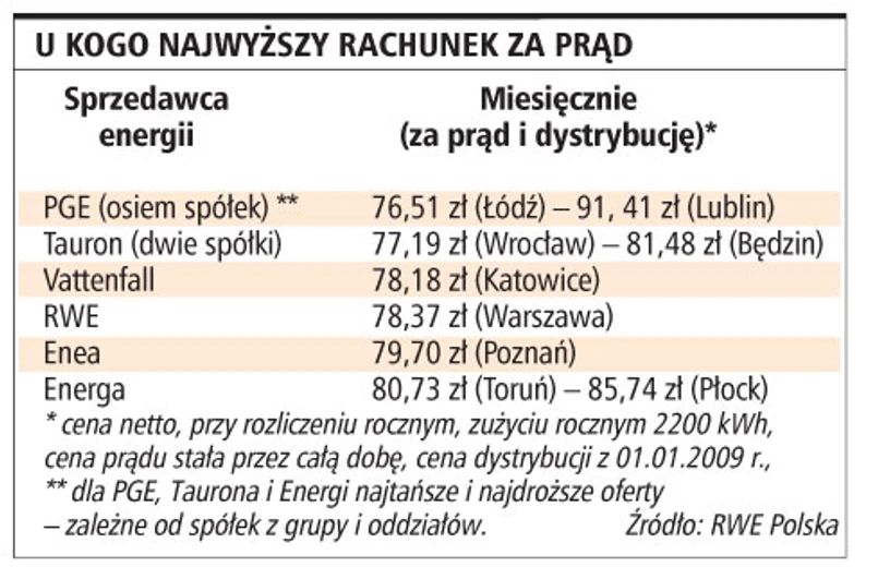 W Polsce działa 14 firm sprzedających energię gospodarstwom domowym. Aż 12 z nich należy do polskich państwowych grup energetycznych. Firmy te kontrolują około 90 proc. rynku sprzedaży energii odbiorcom indywidualnym. Pozostali dwaj sprzedawcy to szwedzki Vattenfall Sales Poland i niemiecki RWE Polska. I to oni - bez zgody Urzędu Regulacji Energetyki - podnoszą od lutego ceny energii. Vattenfall przyznaje, że zaproponowana przez niego cena jest o około 10 proc. wyższa niż u polskich sprzedawców.