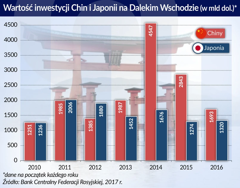 Dotychczasowy wkład inwestycyjny Japonii na rosyjskim Dalekim Wschodzie jest ograniczony, wyniósł ok. 1,3 mld dol. w 2016 roku. Rosja liczy na to, że uda się jej pozyskać kapitał japoński do realizacji wspólnych projektów inwestycyjnych, zwłaszcza na Sachalinie, a także zwiększyć eksport surowców energetycznych do Japonii.