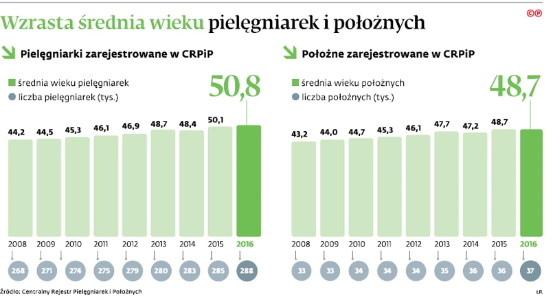 Dane dotyczące liczby pielęgniarek i położnych, które w najbliższym czasie nabędą uprawnienia emerytalne, nie martwiłyby tak bardzo, gdyby perspektywy w zakresie zatrudnienia nowych pracowników były lepsze. Niestety nie są. – Mamy obawy poparte informacjami z okręgowych izb, że pielęgniarek i położonych będzie coraz mniej. Ogromna liczba osób, które odejdą na emeryturę w najbliższych czterech latach i niewielkie zainteresowanie wykonywaniem tych zawodów nie napawają optymizmem – podkreśla Mariola Łodzińska, wiceprezes Naczelnej Rady Pielęgniarek i Położnych. Co prawda absolwentek kierunków pielęgniarskich jest co roku 5–6 tys., jednak tylko 3,6–3,8 tys. występuje do okręgowych izb o prawo do wykonywania zawodu, a już tylko ok. 1,8 tys. podejmuje pracę w wyuczonym fachu. – To pokazuje skalę niedoboru kadry pielęgniarskiej i położniczej, jaka nas czeka w przyszłości – podkreśla Łodzińska.