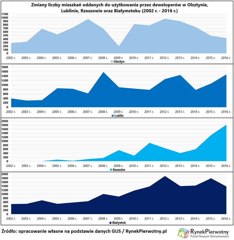 Dane GUS-u wskazują, że pomimo tych niekorzystnych uwarunkowań, największe rynki deweloperskie z tzw. „ściany wschodniej”, cechowały się długookresowym wzrostem aktywności inwestycyjnej. Można się o tym przekonać, analizując liczbę mieszkań ukończonych przez deweloperów. W kontekście danych Głównego Urzędu Statystycznego, szczególnie ciekawie wygląda przykład Rzeszowa. To miasto do połowy minionej dekady, cechowało się praktycznie zerową aktywnością firm deweloperskich. Nawet w czasach boomu hipotecznego (2005 r. - 2008 r.), liczba mieszkań deweloperskich oddawanych do użytku na terenie Rzeszowa, nie przekraczała poziomu 200 sztuk rocznie. Po prawie dziesięciu latach, sytuacja wygląda już zupełnie inaczej. Dane GUS-u wskazują, że od stycznia do grudnia 2016 r. firmy deweloperskie działające w Rzeszowie, ukończyły ponad 1800 mieszkań. Znacznie niższy wynik dla 2016 roku, odnotowano między innymi w Łodzi (1379). Pod względem stosunku między liczbą lokali ukończonych przez deweloperów i wielkością populacji, Stolica Podkarpacia plasuje się już w ścisłej krajowej czołówce.
