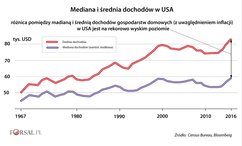 Mediana dochodów gospodarstw domowych, po dostosowaniu do inflacji, wzrosła o 3,2 proc. w 2016 r. do poziomu 59 tys. i 39 dolarów, podczas gdy średni dochód rósł w nieco szybszym tempie - 3,6 procent - do 83 tys. 143 dolarów. W ten sposób różnica pomiędzy średnią a medianą w 2016 r. powiększyła się do 24 tys. 104 dolarów, z 23 tys. 35 USD w 2015 roku. Gdy przeprowadzono pierwsze takie badanie, w 1967 roku, różnica ta wynosiła zaledwie 5 tys. 318 USD.