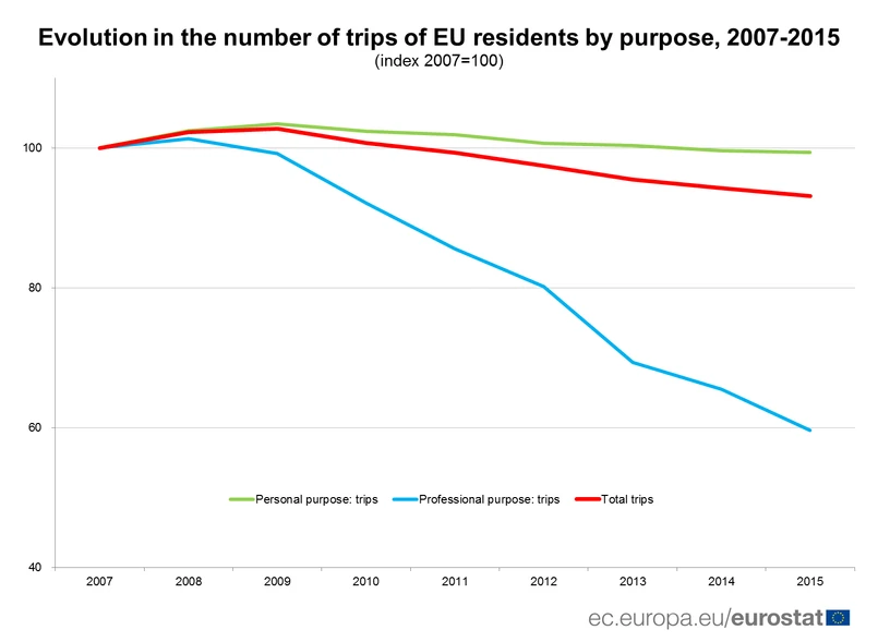 Z danych Eurostatu wynika, że w latach 2007 i 2015 liczba wyjazdów unijnych turystów w celach osobistych, takich jak wypoczynek, święta lub odwiedziny przyjaciół i krewnych, utrzymywała się na poziomie około miliarda podróży rocznie, podczas gdy liczba podróży służbowych wyraźnie spadła. W roku 2015 było o 40 proc. mniej wyjazdów służbowych niż w 2007 r. (średnio spadek wynosił o 6,3 proc. rocznie). W 2007 w UE celach biznesowych podróżowano 206 milionów razy. W 2015 tego typu przejazdów odnotowano już tylko 123 miliony.