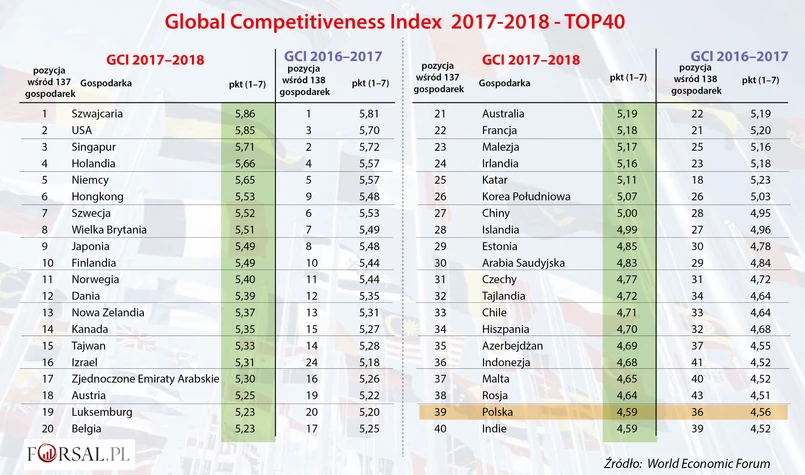 A jak wypadła Polska? Niestety w tegorocznym rankingu konkurencyjność spadliśmy o trzy pozycje na 39. miejsce. Co prawda ogólny indeks konkurencyjności dla Polski nieznacznie wzrósł do 4,59 pkt (na 7 możliwych) z 4,56 pkt, jednak inne kraje zyskiwały więcej.