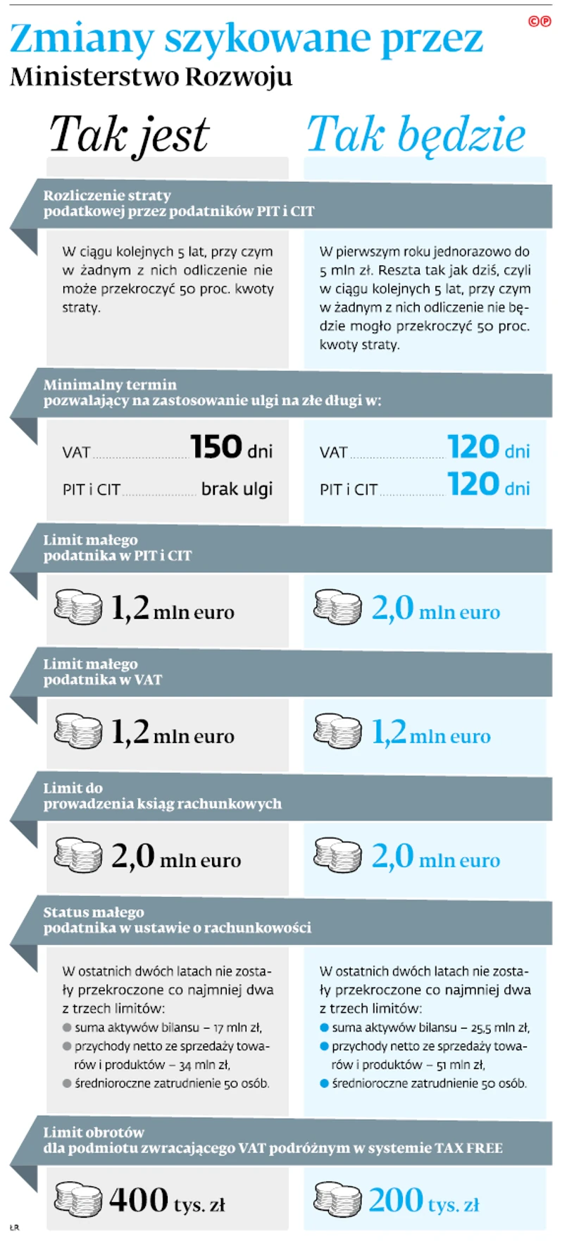 Z 1,2 mln euro do 2 mln euro ma się zwiększyć limit przychodów pozwalający na uznanie podatnika za „małego”. Taki status daje np. prawo do jednorazowej amortyzacji środków trwałych do kwoty 50 tys. euro (niezależnie od tego od 12 sierpnia 2017 r. obowiązują inne przepisy, które również uprawniają do jednorazowej amortyzacji wszystkich, nie tylko małych podatników).