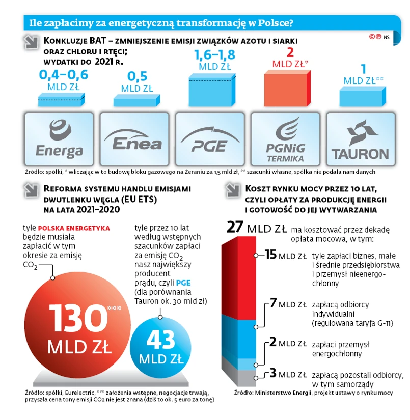 W najbliższych latach energetykę czekają wielkie wydatki. Nawet 100 mld zł mogą pochłonąć inwestycje w bloki gazowe i węglowe (lub atom). Do tego musimy znaleźć jeszcze 130 mld zł na opłaty za emisję dwutlenku węgla w latach 2021––2030. Rachunek zwiększy się i to już do 2021 r. o koszty dostosowania elektrowni do tzw. konkluzji BAT (best available technology, z ang. najlepsza dostępna technologia) – chodzi o zmniejszenie emisji związków siarki oraz azotu, chloru i rtęci. Wyniosą one ok. 6 mld zł – tak szacuje „energetyczna piątka” (PGE, Enea, Energa, Tauron, PGNiG Termika). Według innych źródeł przystosowanie polskiej energetyki do BAT może kosztować nawet 15 mld zł do 2021 r. Lista instalacji do modernizacji jest całkiem długa, a czasu mało. A to akurat dobra wiadomość dla firm budowlanych, które liczą na kontrakty w elektrowniach.