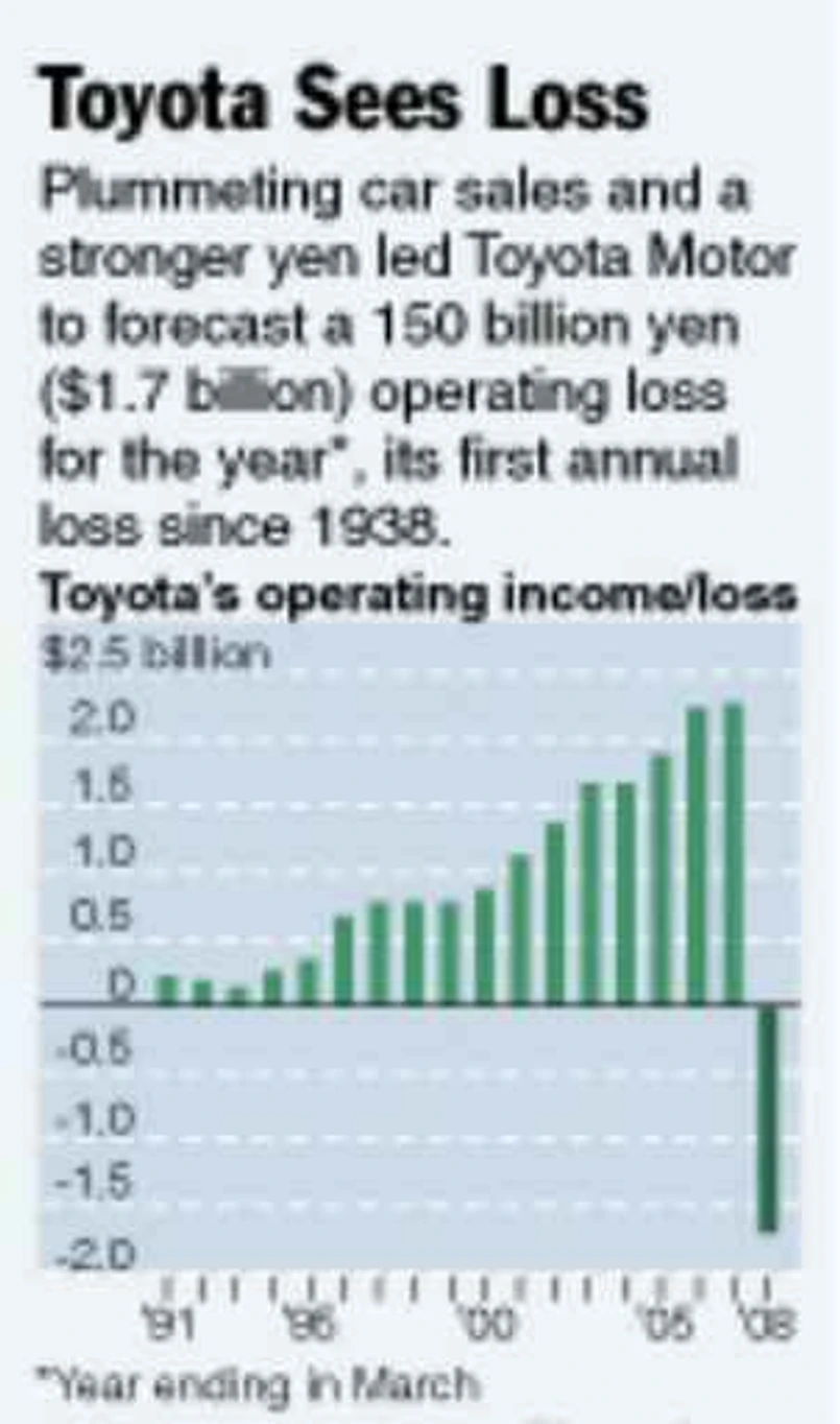 Pod koniec grudnia Toyota podała, że po raz pierwszy w swej historii w budżecie na lata 2008-2009 odnotuje straty. Wynikają one - jak tłumaczyła - z załamania się światowych rynków, które stawiają kompanię w "wyjątkowej sytuacji bez precedensu".