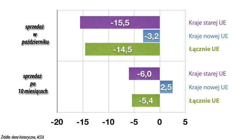 Spadki były szczególnie spektakularne w grudniu 2008 roku: W Hiszpanii o 49,9 proc., w Wielkiej Brytanii o 21,2 proc., we Włoszech o 13,3, proc., w Niemczech o 6,6 proc., we Francji o 15,8 proc. Na podstawie tych danych KE prognozuje, że w 2009 roku sprzedaż nowych aut spadnie o kolejne 10-20 proc.