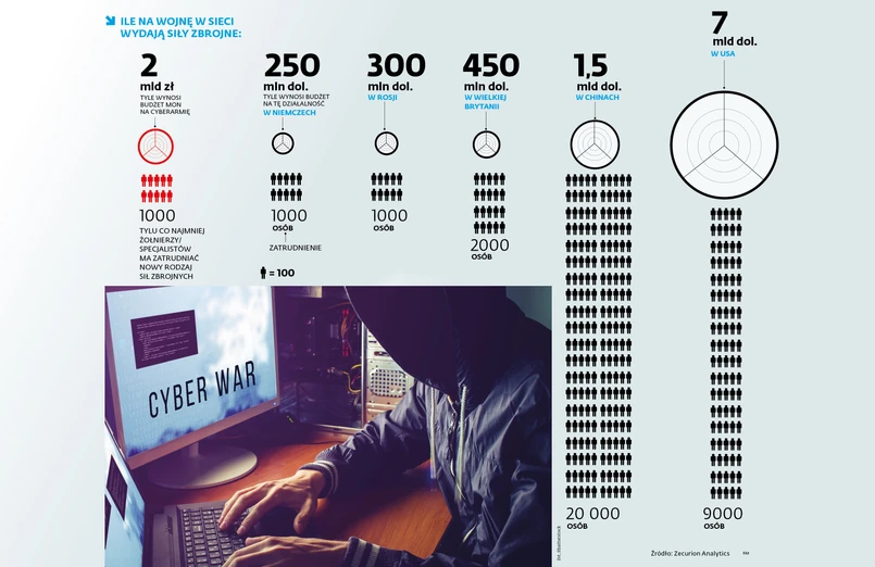 W cyberarmię inwestuje też Wielka Brytania. Tamtejsze ministerstwo obrony zapowiedziało, że na program Cyber Vulnerability Investigations wyda 265 mln funtów, z czego ok. 40 mln na samo Cyber Security Operations Centre, czyli centrum dowodzenia działaniami cybernetycznymi. – Polskie 2 mld zł na tym tle wyglądają naprawdę okazale. Ale pamiętajmy, że mamy o wiele więcej do zrobienia od podstaw. W krajach zachodnich inwestycje w cyfrowe kompetencje w wojsku były podejmowane już od wielu lat – mówi nam szef jednej z państwowych instytucji. ⒸⓅ