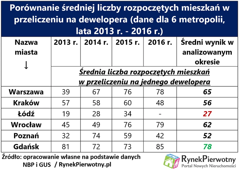 W powyższej tabeli ciekawie wygląda również sytuacja Łodzi, która przez cały analizowany okres cechowała się zdecydowanie najmniejszą liczbą rozpoczynanych mieszkań w przeliczeniu na jedną aktywną firmę deweloperską. Wyniki dotyczące łódzkiego rynku, można wytłumaczyć jego niewielką dynamiką i skromnym potencjałem. Uciążliwa konkurencja cenowa ze strony rynku wtórnego, skłoniła łódzkich deweloperów do postawienia na droższe lokale, które mogą zainteresować tylko bardziej zamożnych łodzian. Między innymi z tego powodu, w Łodzi widoczny jest wzrost średniej ofertowej ceny 1 mkw. nowych mieszkań. Ta wartość przekracza już 5170 zł/mkw. (dane RynekPierwotny.pl z III kw. 2017 r.). Cztery lata temu, przeciętna stawka w cennikach łódzkich deweloperów oscylowała jeszcze na poziomie 4500 zł/mkw.