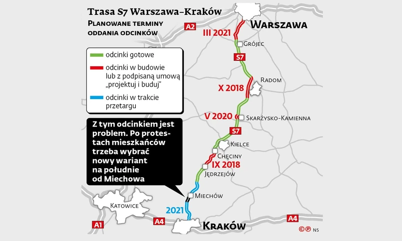 Znaki zapytania wiążą się za to z 56-kilometrowym odcinkiem S7 w Małopolsce – z Krakowa na północ. Jan Krynicki, rzecznik Generalnej Dyrekcji Dróg Krajowych i Autostrad, przyznaje, że jest problem z fragmentem koło Miechowa. Mieszkańcy wsi Poradów nie chcą trasy obok swoich domów. Wojewódzki Sąd Administracyjny przychylił się do ich skargi. – Dla 5-kilometrowego odcinka trasy potrzebna jest nowa decyzja środowiskowa – tłumaczy Krynicki. Drogowcy wybrali firmę, która musi znaleźć kompromisowy wariant i uzyskać zgodę na jego realizację. Osobno w tym roku będą wybierani wykonawcy projektu i trasy S7 bliżej Krakowa. GDDKiA liczy, że mimo tych problemów do 2021 r. uda się zbudować cały odcinek S7 na północ od stolicy Małopolski.