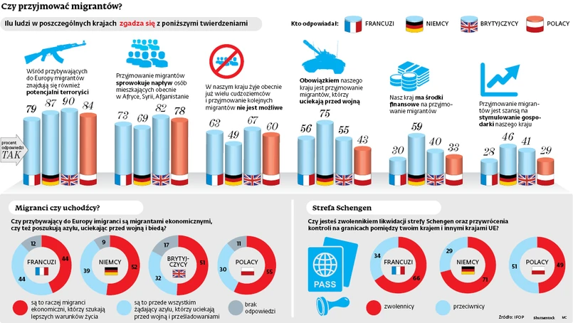 Francuzi, Niemcy, Polacy i Brytyjczycy uważają, że wśród napływających do Europy migrantów mogą być potencjalni terroryści. Europejczycy gotowi są zrezygnować z otwartych granic w ramach Schengen na rzecz większego bezpieczeństwa. Postrzeganie współczesnej wędrówki ludów zmieniła fala zamachów, która przetoczyła się przez Stary Kontynent w ostatnich dwóch latach. Takie są wyniki najnowszego, paneuropejskiego badania „Europejczycy i problem migracji” zrealizowanego przez francuski ośrodek badań IFOP. Sondaż pokazuje również, że Polacy nie odstają w radykalny sposób od Zachodu, jeśli chodzi o postrzeganie kryzysu migracyjnego. Nasze poglądy na ten temat są zbliżone do brytyjskich. Fascynujące jest to, że obydwa społeczeństwa podzielają podobne stanowiska, mimo że mają skrajnie odmienne doświadczenia z migrantami. Wielka Brytania została zbudowana na sile przybyszów. W Polsce temat napływu obcokrajowców – nie licząc bliskich kulturowo Ukraińców i Białorusinów, którzy wybierają Polskę jako miejsce pracy i osiedlania się – jest wciąż teorią.