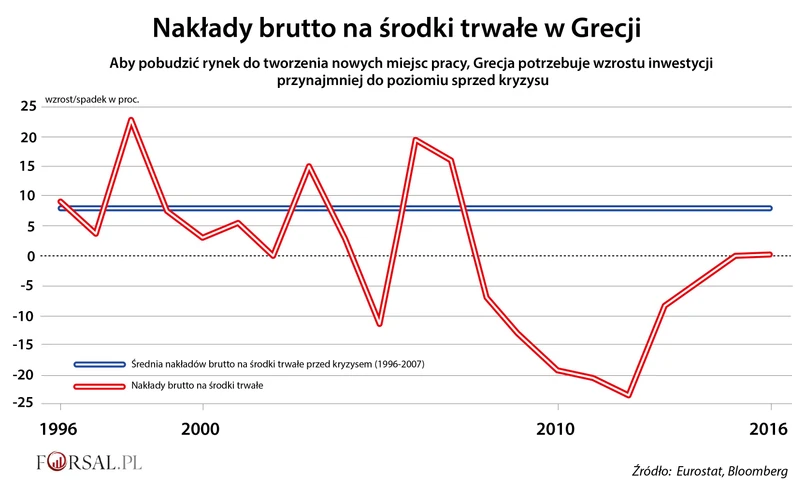 Premier Alexis Tsipras starał się, aby wzrost wiary w stabilność greckiej gospodarki spowodował napływ inwestycji. Jak się okazuje staranie greckiego premiera to za mało. W 2016 r. nakłady brutto na środki trwałe w Grecji praktycznie stały w miejscu, a w pierwszej połowie tego roku wzrosły zaledwie o 2,7 proc.