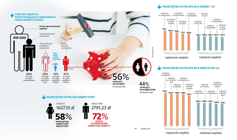 Dane ZUS pokazują silne zróżnicowanie regionalne wypłat. Przeciętne emerytury kobiece są najwyższe w Warszawie, natomiast najniższe w Pile. Ale w przypadku mężczyzn najwyższe są na Śląsku – w Rybniku – na czym zaważyły emerytury wyliczane za pracę w kopalniach. Najniższe świadczenia panowie pobierają w Nowym Sączu.