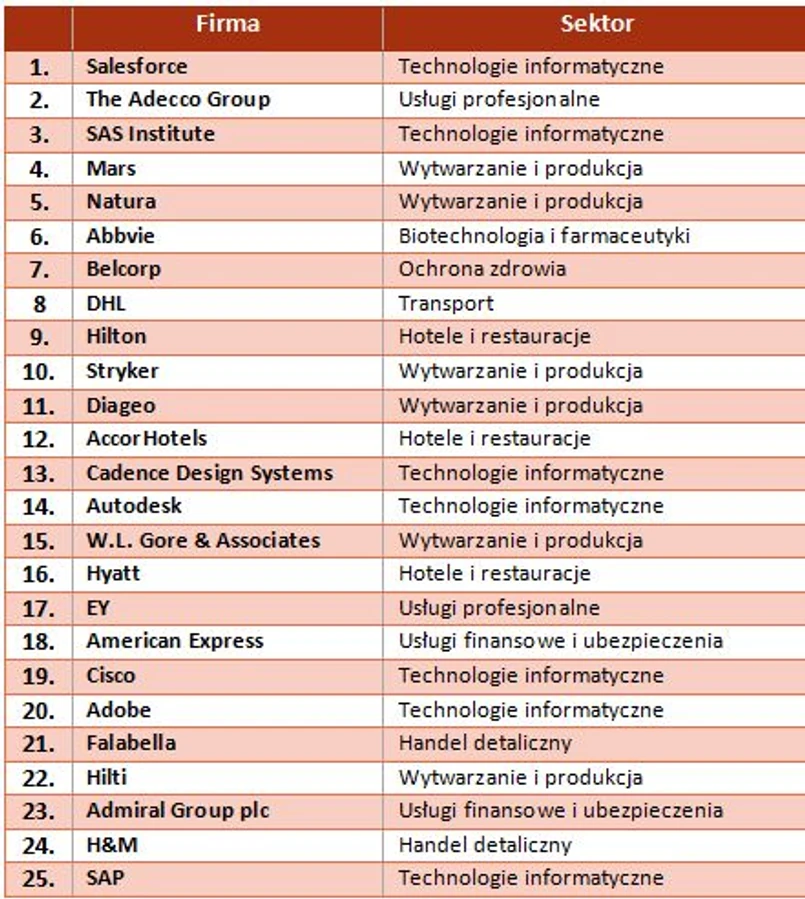 Lista 25 Najlepszych Miejsc Pracy na świecie została przygotowana przez Great Place to Work. Stawkę światowego zestawienia otwierają: Salesforce (IT), The AdeccoGroup (usługi profesjonalne) i SAS Institute (IT). Technologie informatyczne z udziałem 28 proc. pozostają branżą najliczniej reprezentowaną na liście, a na drugim miejscu tradycyjnie uplasowała się branża produkcyjna (24 proc.). „Tegoroczni laureaci dowodzą, że środowisko pracy bazujące na obopólnym zaufaniu i polityka firmy stawiająca na efektywność, nie tylko nie wykluczają się, ale są od siebie bezpośrednio zależne” – podsumował tegoroczną edycję konkursu Michael C. Bush, Prezes Great Palce to Work.