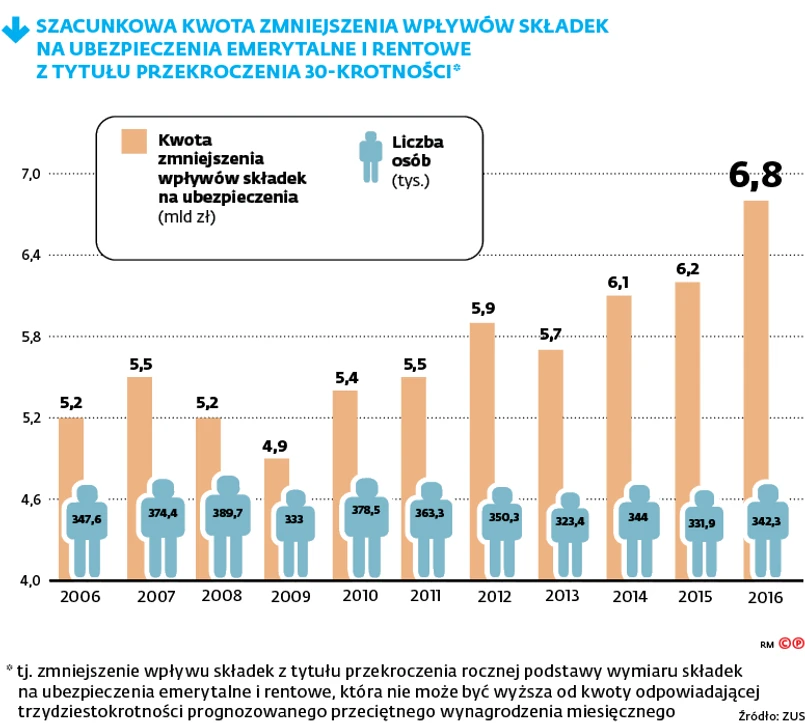 Rząd, szukając pieniędzy, postanowił znieść górny limit składek na ubezpieczenia emerytalne i rentowe. Od 2018 r. mają być odprowadzane od całości przychodu, a nie – jak dotąd – do 30-krotności przeciętnego wynagrodzenia. Chociaż budżet i samorządy stracą na zmianach, bo spadną wpływy z podatków PIT i CIT, to poprawi się kondycja Funduszu Ubezpieczeń Społecznych.