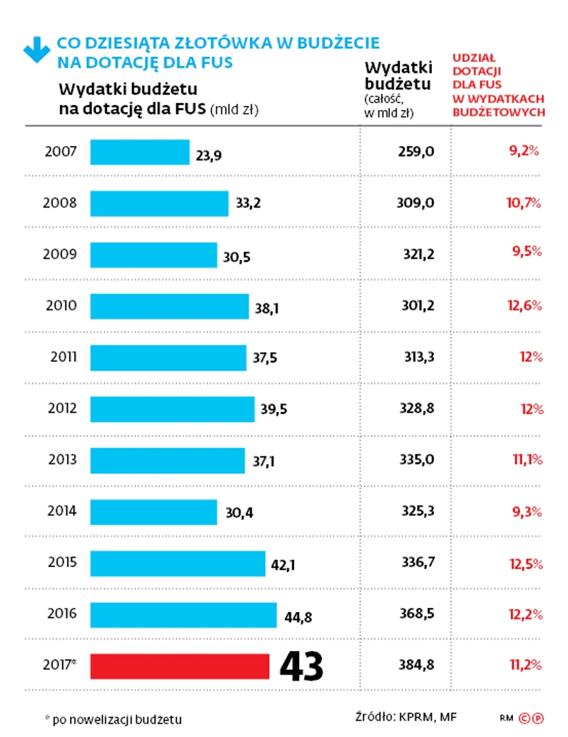 W projekcie ustawy budżetowej założono, że wpływy do FUS w porównaniu z tym rokiem wzrosną o niemal 7 proc. Eksperci oceniają, że to wynik realny, ale może okazać się trudny do przebicia o kilka miliardów złotych, o ile nie pojawią się nadzwyczajne wzrosty płac.